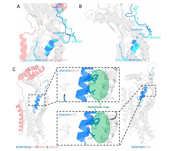 BGM1812是在AI輔助分子篩選與分子動力學模擬指導下設計的一種新型雙靶點多肽分子。予路乾行研究團隊首先以Petrelintide為基礎,采用分子動力學方法,發(fā)現(xiàn)其Ile(Me)24突變?yōu)镚ly(Me)24后可形成BGM1802,進而顯著提升抗聚集傾向。模擬結果進一步揭示,BGM1802在AMY3R與CTR的結合位點中,其L12、F15、L16三聯(lián)疏水殘基與受體內(nèi)疏水殘基可共同構建"疏水籠"結構,增強受體配體復合物的穩(wěn)定性,并促進受體激活。