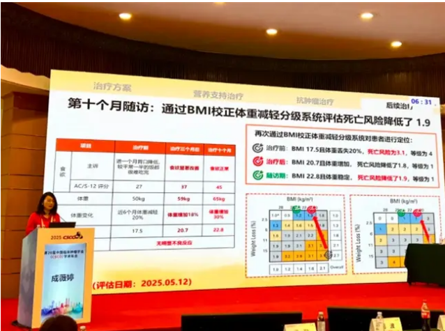 接著,湖北省人民醫(yī)院成薇婷教授從結(jié)合臨床實(shí)際案例出發(fā),展示了營養(yǎng)治療在腫瘤惡病質(zhì)患者中的積極作用。該例食管癌患者,68 歲,男性,因進(jìn)行性吞咽困難就診,最終確診為 CACS ?;?BMI 校正的體重丟失分級(jí)系統(tǒng),定位為 4 級(jí),死亡風(fēng)險(xiǎn)為 3.1。確診后,患者同時(shí)接受抗腫瘤治療和納米晶型甲地孕酮口服混懸液治療。治療 3 個(gè)月后,患者食欲恢復(fù)正常,體重增加 9 kg, BMI 校正體重減輕分級(jí)系統(tǒng)等級(jí)改善至 1 級(jí),死亡風(fēng)險(xiǎn)降低 1.8 ;繼續(xù)治療 10 個(gè)月后,體重進(jìn)一步升高,BMI 校正體重減輕分級(jí)系統(tǒng)等級(jí)為 1 級(jí),死亡風(fēng)險(xiǎn)降低 1.9。這一治療過程體現(xiàn)了納米晶型甲地孕酮口服混懸液通過「改善患者食欲,進(jìn)而促進(jìn)其體重恢復(fù),再到延長其總生存期(OS)」的良性循環(huán),為腫瘤患者的綜合治療提供了有力支持。