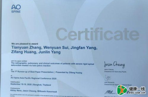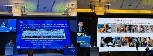 會上,張?zhí)煸┦看韴F(tuán)隊分享了重度僵硬性脊柱畸形頭盆環(huán)及頭顱重力牽引的臨床治療結(jié)果,研究回答了頭顱環(huán)牽引(HGT)和頭盆環(huán)牽引(HPT)在重度脊柱畸形牽引中的優(yōu)缺點,并在前期臨床實踐的基礎(chǔ)上提出了一種新型頸部可活動的頭盆環(huán)牽引架,研究結(jié)果證實了可活動頭盆環(huán)牽引可更大程度獲得重度僵硬脊柱畸形的畸形矯正和肺功能改善,有效減少畸形嚴(yán)重程度和手術(shù)截骨等級,降低手術(shù)脊髓神經(jīng)損傷和肺部并發(fā)癥的發(fā)生率,獲得更好的脊柱畸形矯正,相關(guān)工作獲得業(yè)界同行的廣泛認(rèn)可和肯定。該項研究也因其貢獻(xiàn)和臨床意義獲得了2025年度亞太區(qū)脊柱大會的最佳論文獎。
