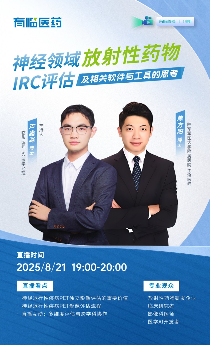 8月21日(周四)19:00,歡迎鎖定有臨醫(yī)藥直播間——主持人臨影醫(yī)藥醫(yī)學經(jīng)理蘆鑫淼博士,將邀請復(fù)旦大學博士、陸軍軍醫(yī)大學附屬醫(yī)院主治醫(yī)師焦方陽博士,共探神經(jīng)領(lǐng)域放射性藥物影像評估的標準化、自動化與智能化前沿。