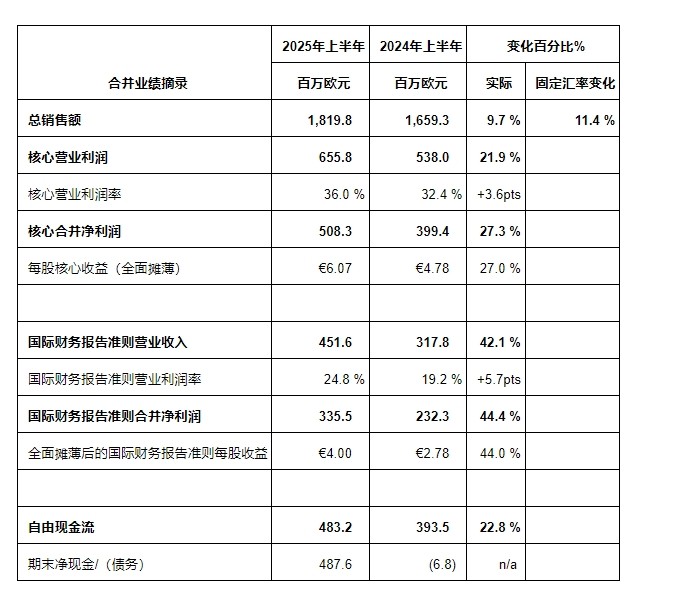 上半年核心營(yíng)業(yè)利潤(rùn)為6.56億歐元,增長(zhǎng)21.9%,核心營(yíng)業(yè)利潤(rùn)率占總銷(xiāo)售額的36.0%,增長(zhǎng)3.6個(gè)點(diǎn);